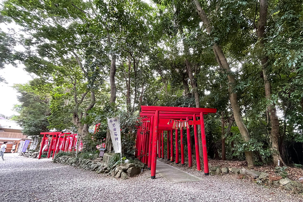 神明神社の参道にある、石神(いしがみ)さんと呼ばれ、親しまれる小さな社。昔から地元の海女が豊漁と安全を祈願してきた社です。祭神は神武天皇の母君 玉依姫之命(たまよりひめのみこと)女神といわれ、女性の願い事なら、必ず一つは叶えてくれると、古くから言い伝えられており、今では多くの女性の方々がお参りにこられます。