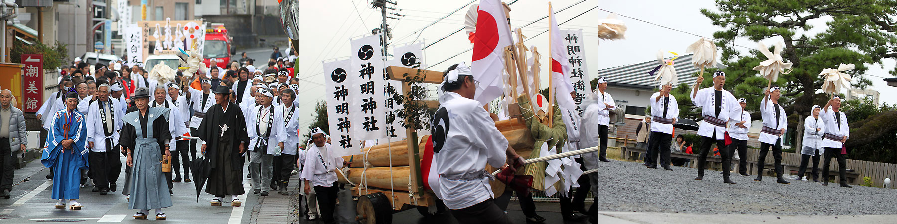 最近では、2013年の秋、55年ぶりとなる社殿の建て替えが行われ、境内へご神木を運ぶために町内を練り歩く「お木曳(おきひき)」や「木遣り唄(きやりうた)」「白石持ち(しらいしもち)」などの行事が厳かに執り行われました。(下写真)